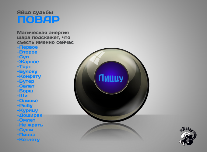 Изысканное блюдо или легкая закуска? Магический шар «Повар» подскажет и даст уникальные советы. Раскрой многообразный мир кухни и возбуди свою кулинарную фантазию.